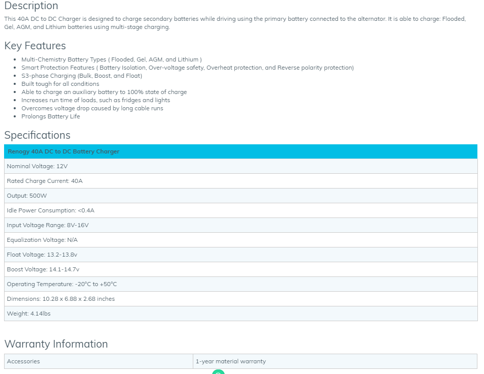 • Renogy 40A 12V DC to DC On-Board Battery Charger