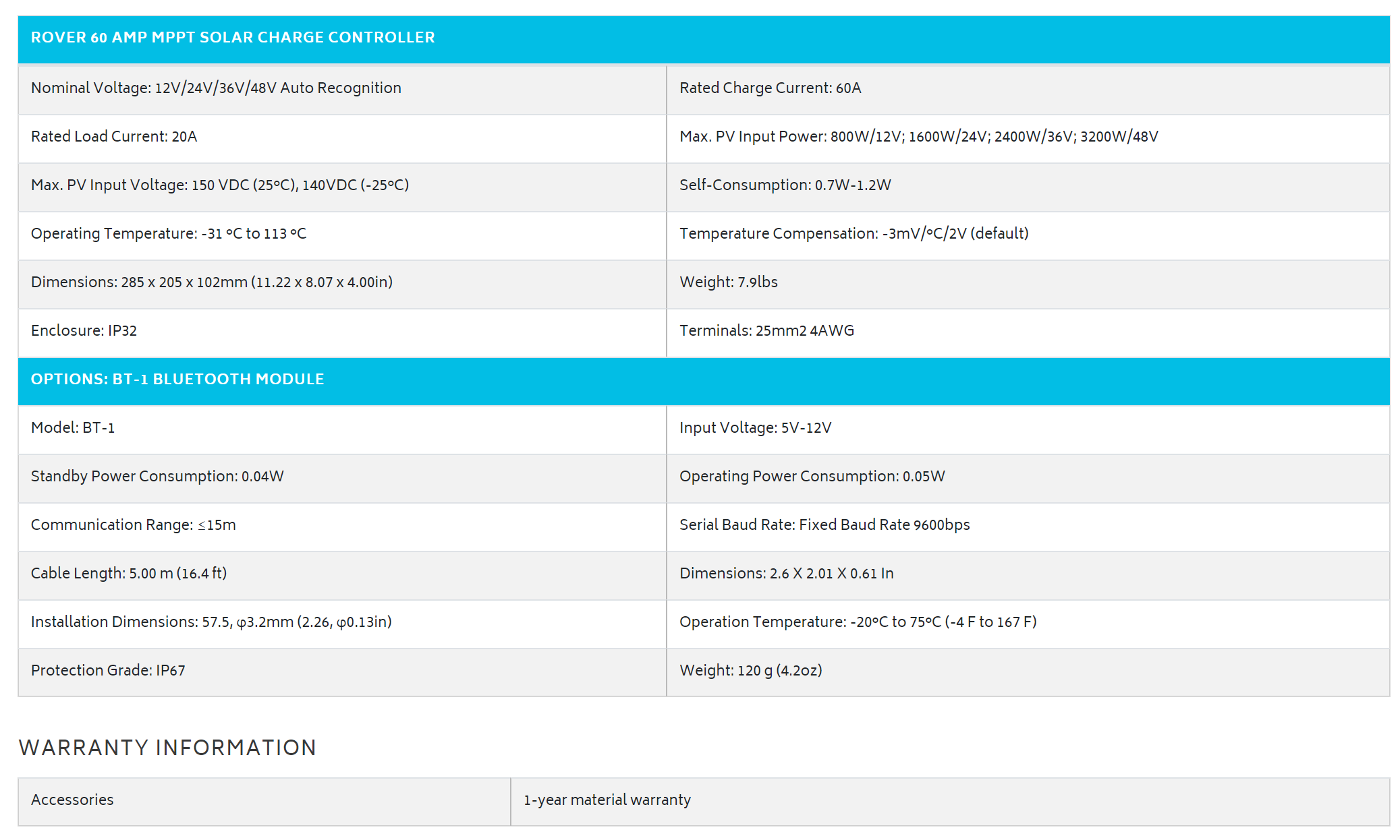 60A Rover MPPT 충전 컨트롤러는 열 분산에 적합한 다이캐스트 알루미늄 셀을 갖추고 있으며, 일반적인 마모와 인열로부터 보호하기도 합니다. 이 지능형 컨트롤러는 최대 99%의 추적 효율성을 제공할 뿐 아니라 시스템 에러를 자체 진단할 수도 있습니다. 이 충전 컨트롤러는 쉽게 이해할 수 있는 오류 코드를 LCD를 통해 표시합니다. 12V/24V 시스템을 자동으로 감지할 수 있는 이 시스템 구성 요소는 GEL 및 리튬과 같은 다양한 배터리 옵션도 구동할 수 있게 합니다. 이 충전 컨트롤러를 Renogy BT-1 및 Renogy BT 애플리케이션과 연결하여 시스템 성능을 실시간으로 휴대폰을 통해 확인하고 별도의 작업을 수행하지 않고도 옵션을 변경하십시오.